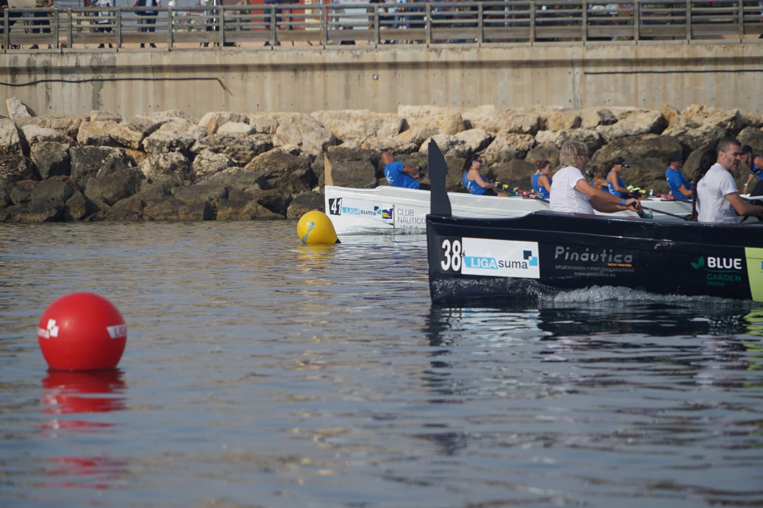 El “100 Paladas Solidarias” completó la jornada solidaria sobre las aguas de Denia. En esta prueba participaron cuatro embarcaciones, que estuvieron formadas por personas que han superado un cáncer de mama. El recorrido quedó establecido 350 metros y se realizó en embarcaciones tradicionales del remo valenciano, conocidas como Falucho/Llaüt Valencià.